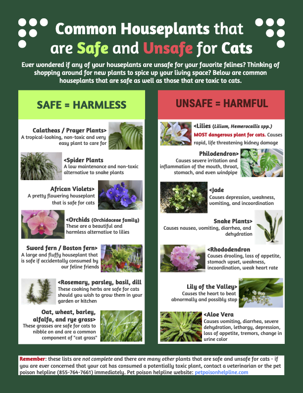 Have you ever wondered if any of your houseplants are unsafe for your favorite felines? Thinking of shopping around for new plants to spice up your living space? Below are two lists of common houseplants that are safe, as well as those that are toxic, to cats. Please note: these lists are not exhaustive, and there are many other plants that are safe and unsafe for cats. If you are ever concerned that your cat has consumed a potentially toxic plant, contact a veterinarian or the pet poison hotline (855-764-7661) immediately. The pet poison helpline website is: https://petpoisonhelpline.com