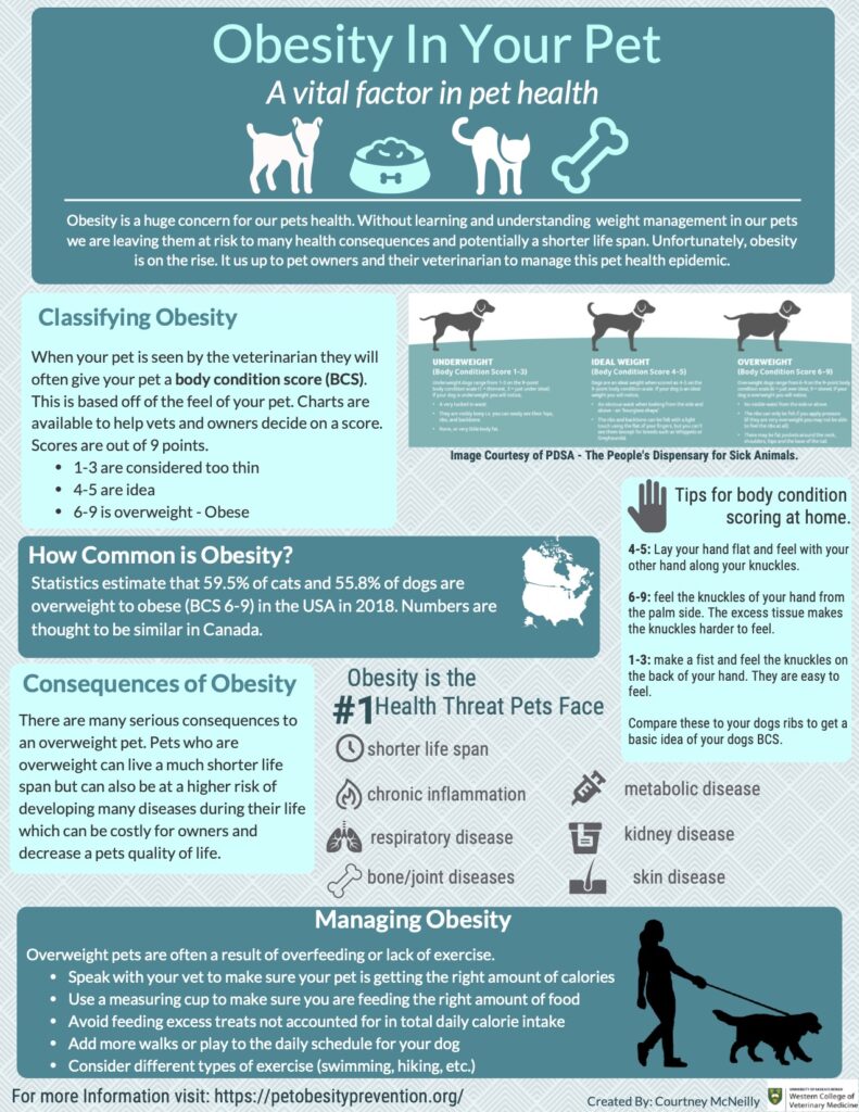 When your pet is seen by the veterinarian they will often give your pet a body condition score (BCS). This is based off of the feel of your pet. Charts are available to help vets and owners decide on a score. Scores are out of 9 points. 1-3 are considered too thin, 4-5 are ideal, and 6-9 is considered overweight to obese. Stats estimate that 59% of cats and 55.8% of dogs are overweight to obese (BCS 6-9) in the USA in 2018. Numbers are thought to be similar in Canada.