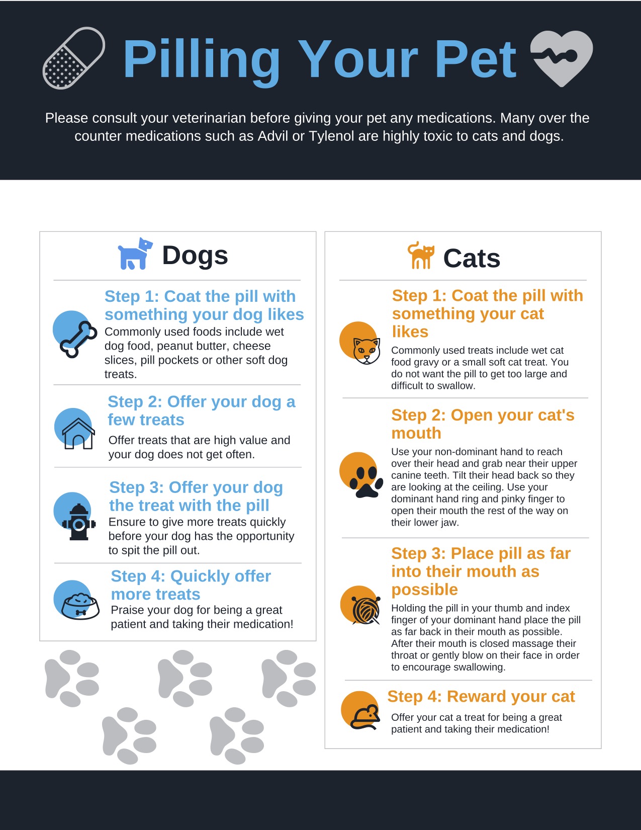Before we get into how to give your pet a pill, it is important to note that you should consult your veterinarian before giving your pet any medications. Many over-the-counter medications such as Advil or Tylenol are highly toxic to cats and dogs.